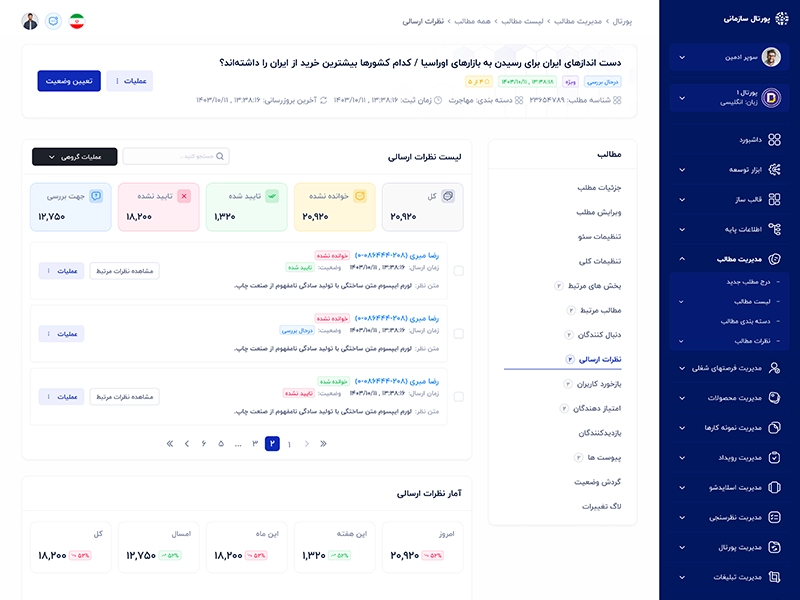 • مدیریت محتوای پیشرفته: امکان ایجاد، ویرایش ، دسته بندی و برچسب گذاری ، گردش کار (Workflow) تأیید محتوا ، تنظیمات مرتبط با سئو ، امتیازدهی و نظردهی برای محتوا و انتشار انواع محتوا شامل صفحات، اخبار ، مطالب ، خدمات ، اطلاعیه ها، اسناد و چندرسانه ای با رابط کاربری ساده و کاربرپسند.