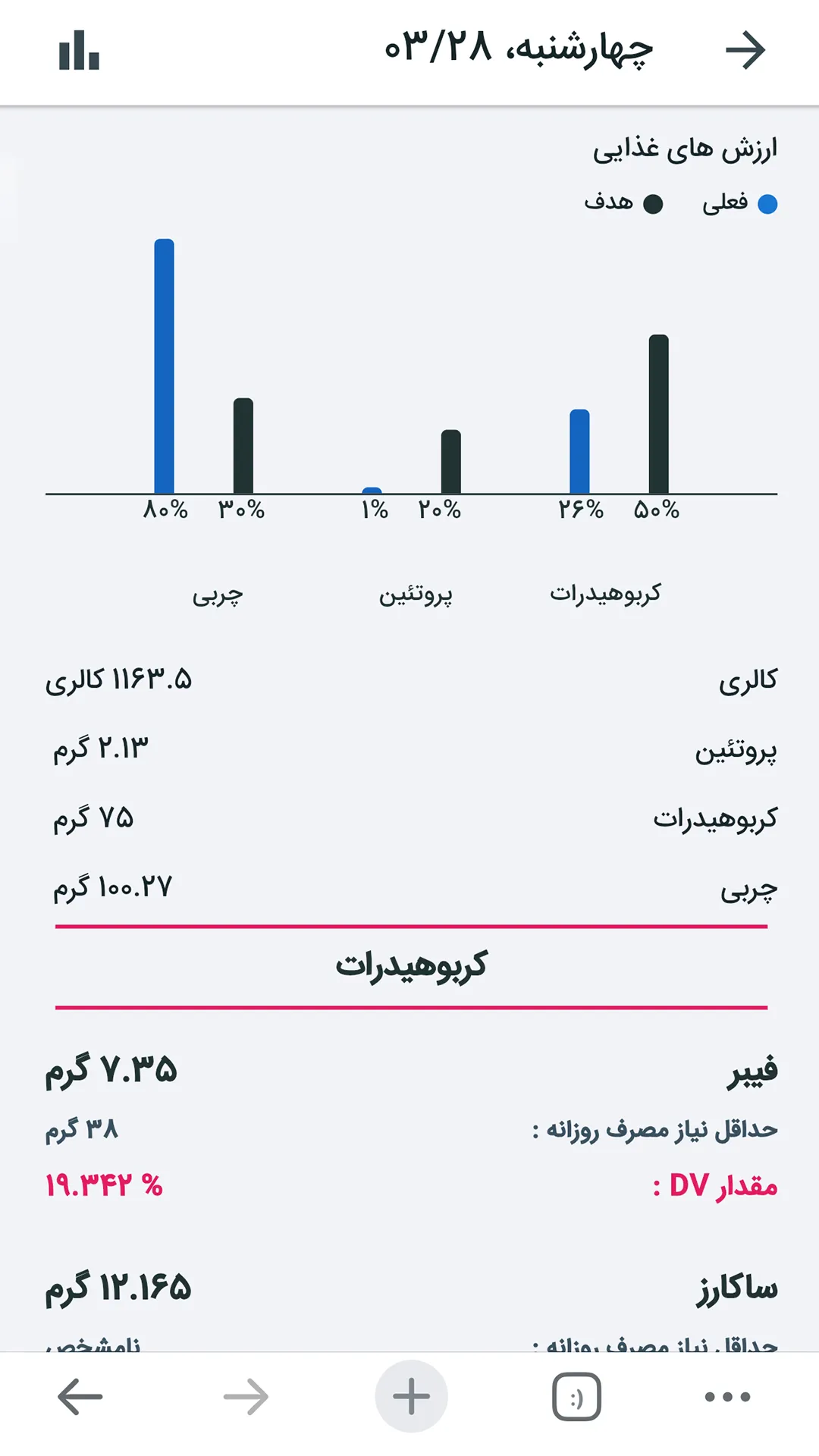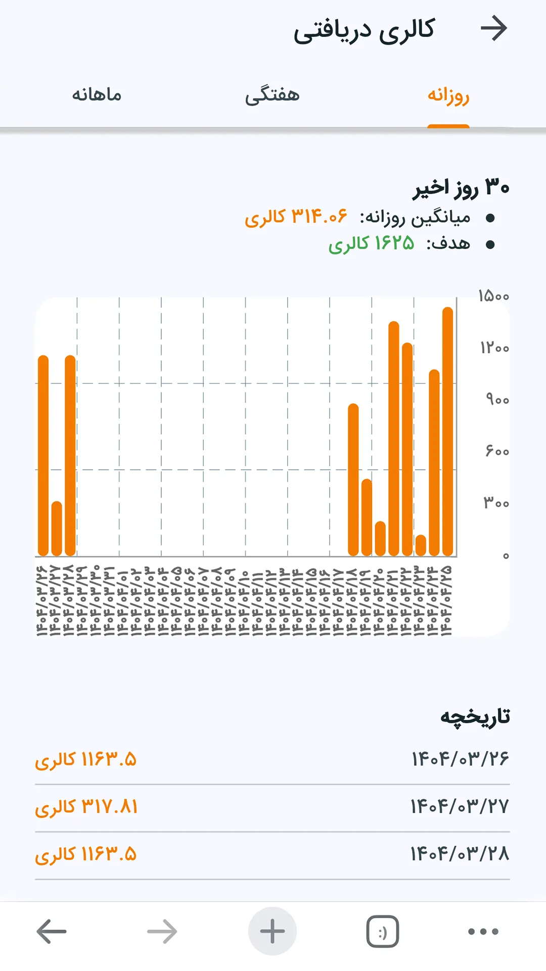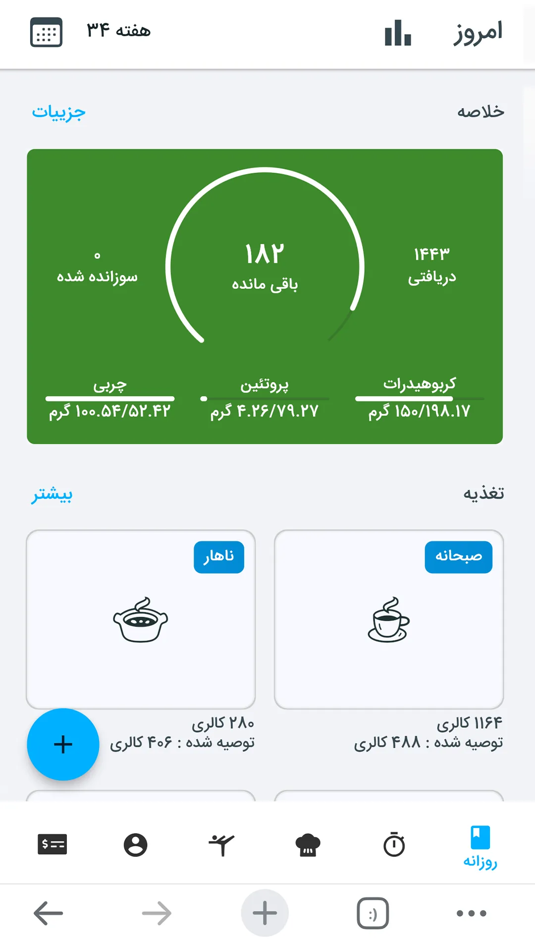 ثبت وعده های غذایی و مشاهده کالری مصرف شده در طول روز.