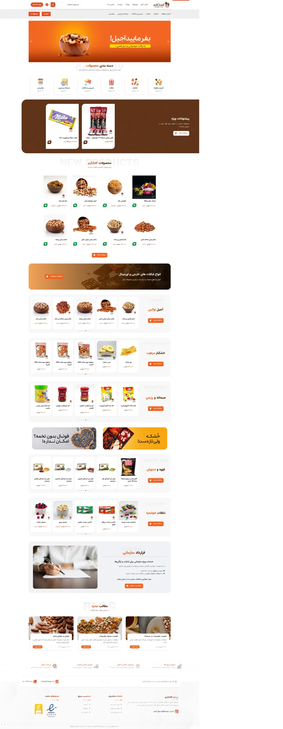 فروشگاه آفتابگرم در زمینه فروش انواع آجیل، خشکبار و تنقلات فعالیت می نماید. وبسایت طراحی شده برای این مجموعه علاوه بر ارائه محصولات در دسته بندی های مجزا، امکاناتی همچون درگاه پرداخت آنلاین، ارائه فاکتور و همچنین اتصال به سیستم حسابداری را دارد.