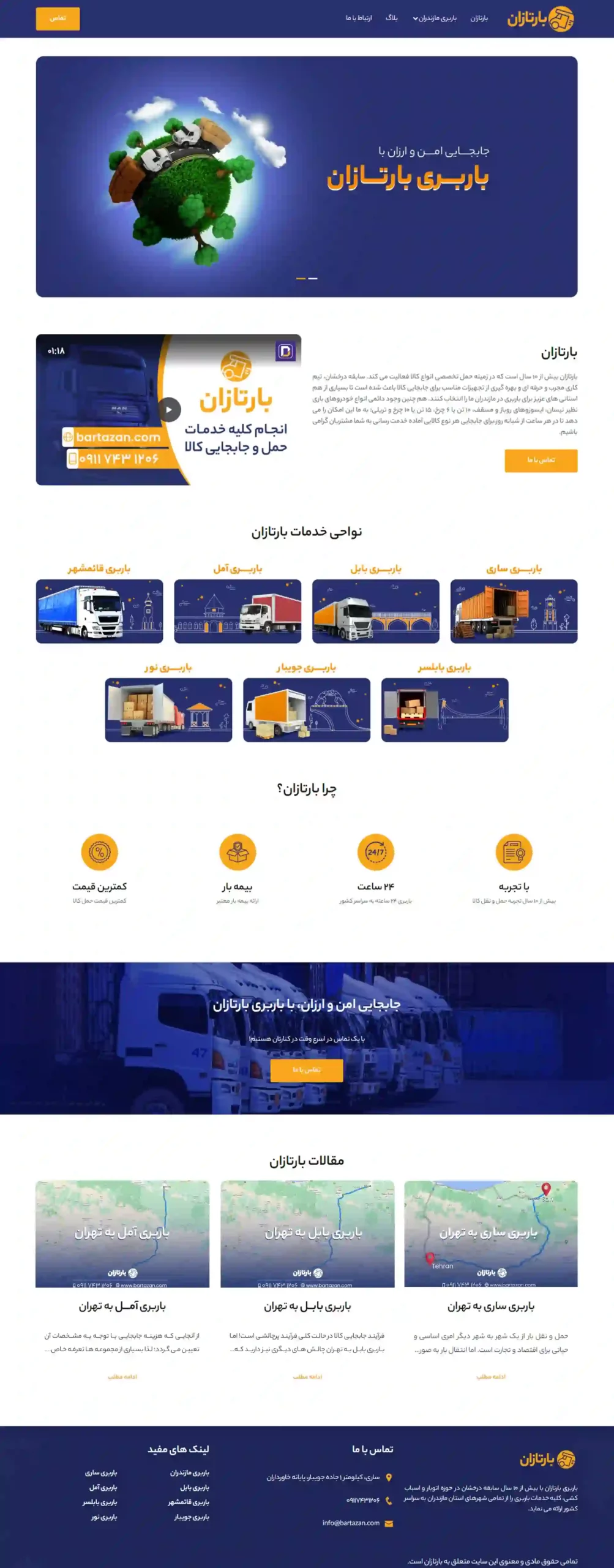شرکت بارتازان در زمینه ارائه خدمات حمل و نقل و باربری در سطح استان مازندران فعالیت می نماید. وبسایت این مجموعه علاوه بر ارائه اطلاعات مفید در زمینه دریافت خدمات جابجایی کالا، در سطح استان مازندران نیز توسط تیم درنیکا سئو شده است.