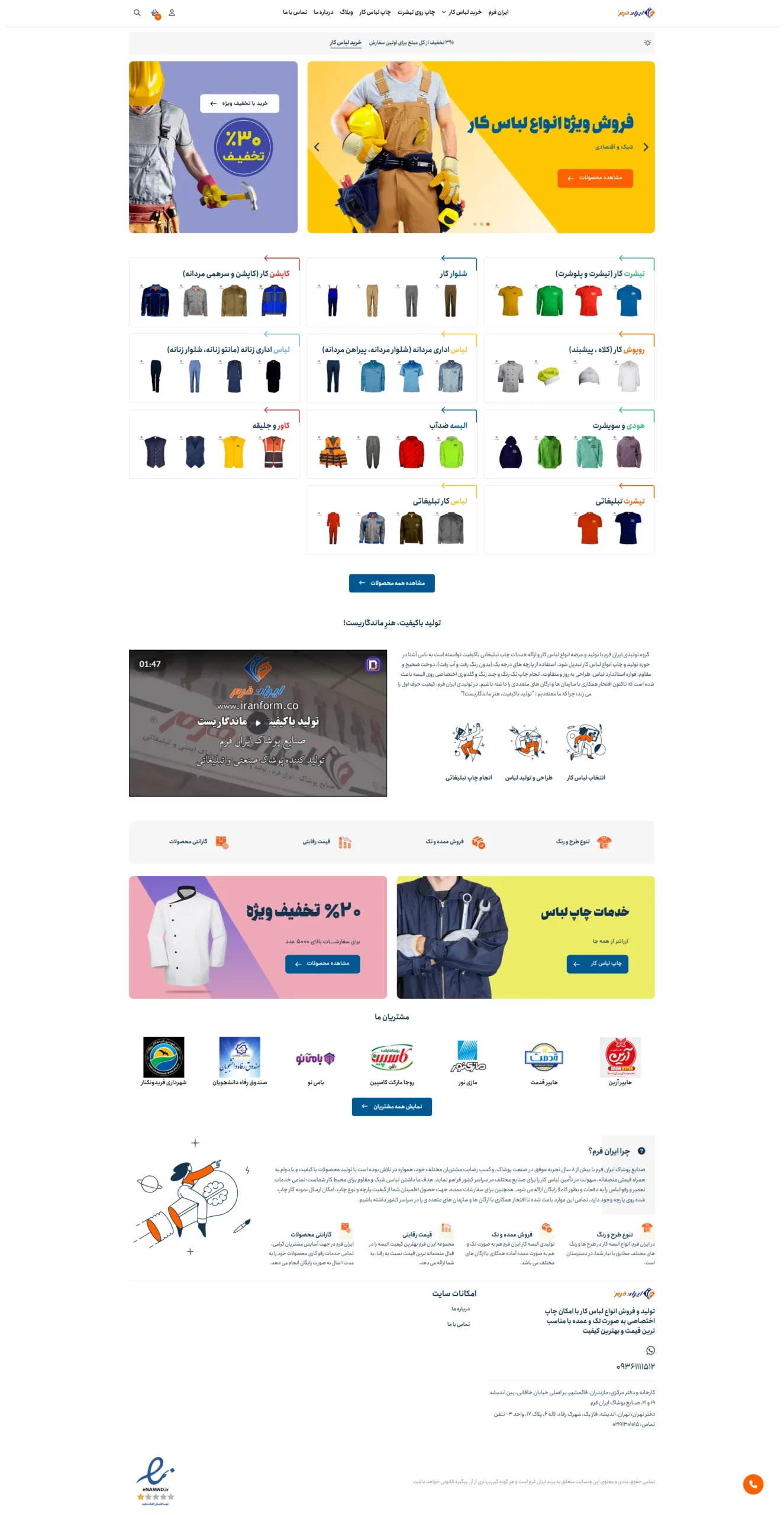 گروه تولیدی ایران فرم در زمینه طراحی، تولید و عرضه انواع لباس کار فعالیت می نماید. کلیه البسه کار با امکان چاپ اختصاصی در این مجموعه فراهم است. کلیه خدمات مجموعه در وبسایت در دسترس است و مشتریان محترم می توانند از آنها بهره مند شوند.